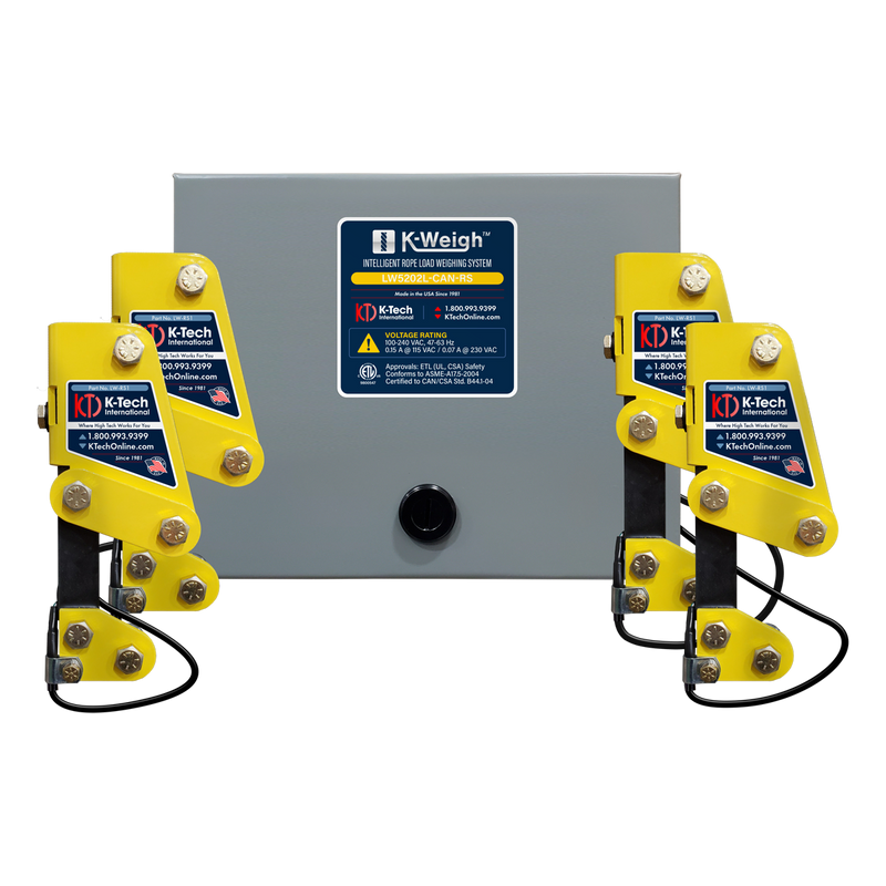 El sistema de rendimiento y pesaje de carga del elevador K-Weigh de fabricación estadounidense de K-Tech incluye nuestra caja de control de salida baja junto con 4 de nuestros sensores de cable de alta capacidad. Los sensores de cuerda fáciles de instalar se montan en los cables de su ascensor para medir el peso total suspendido de la cabina y la carga dentro de la cabina.